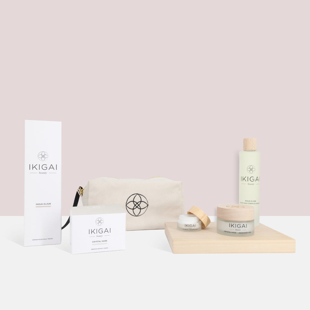 La tua Beauty Case ARIA contiene: 1 Crystal Mask, 1 Ikigai Elisir, 1 Eye Revive.