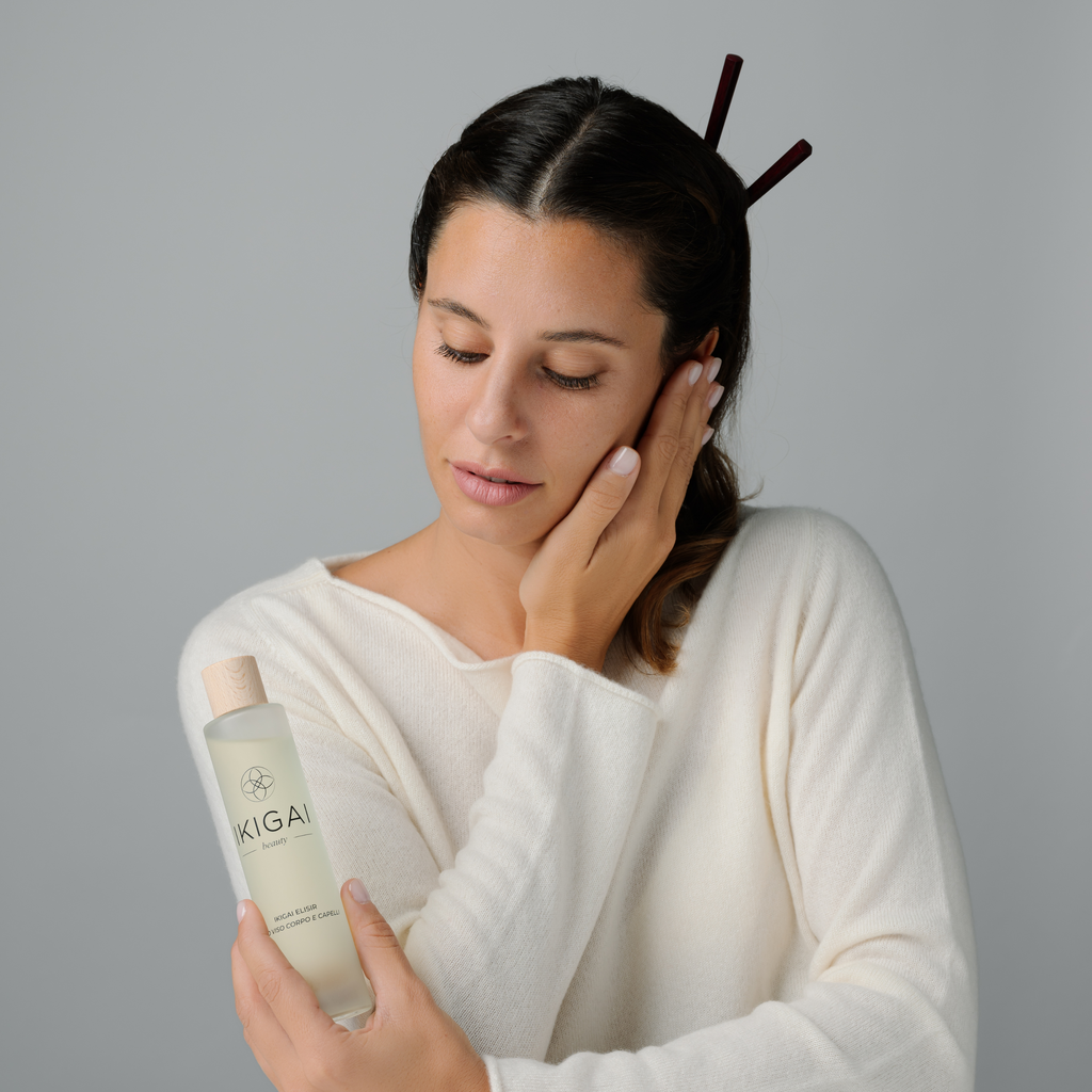 Massaggia alcune gocce di Elisir sul viso prima della detersione. In questo modo faciliti la rimozione di residui liposolubili ed impurità con delicatezza.